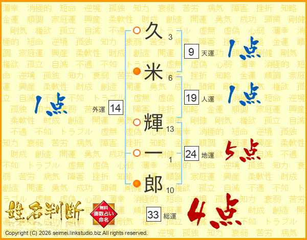 久(3画)米(6画) 輝(13画)一(1画)郎(10画)