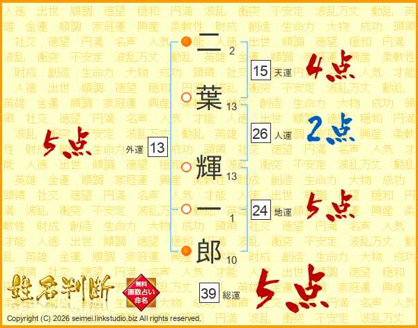 二(2画)葉(13画) 輝(13画)一(1画)郎(10画)