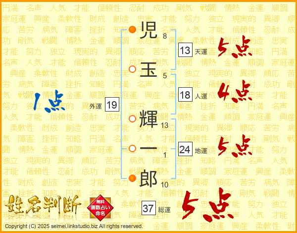 児(8画)玉(5画) 輝(13画)一(1画)郎(10画)