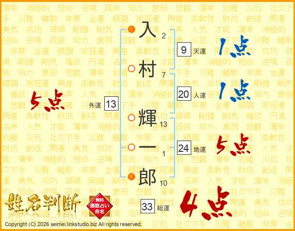 入村輝一郎さんの人運は20画の1点!
