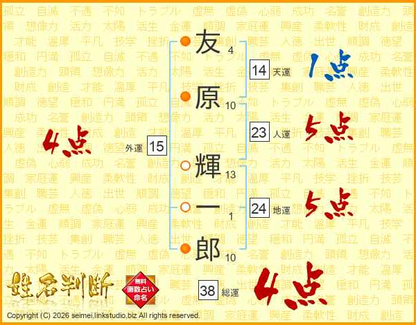 友(4画)原(10画) 輝(13画)一(1画)郎(10画)