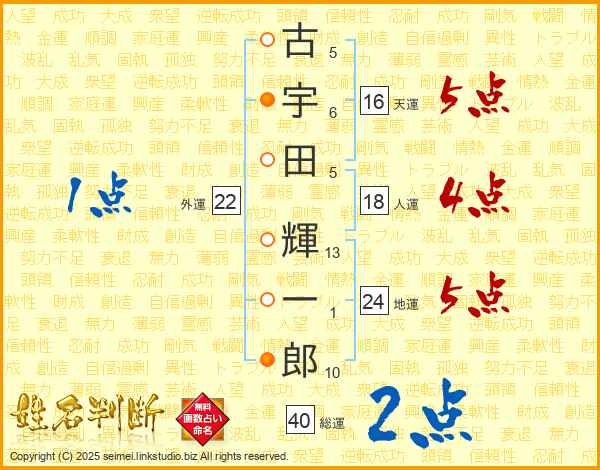 古(5画)宇(6画)田(5画) 輝(13画)一(1画)郎(10画)