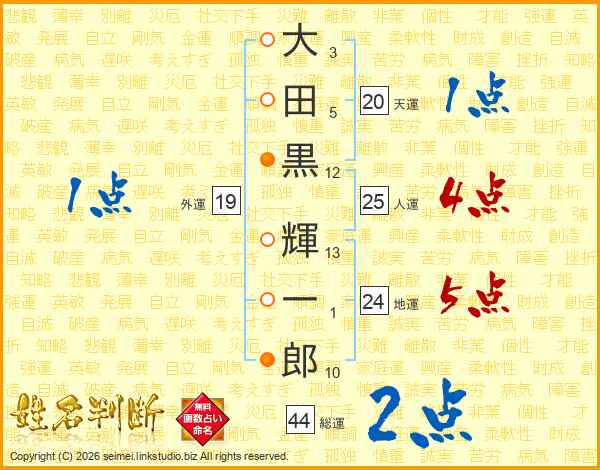 大(3画)田(5画)黒(12画) 輝(13画)一(1画)郎(10画)