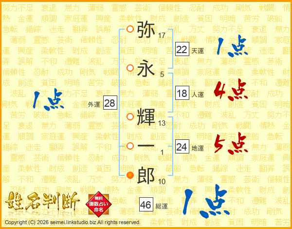 弥(17画)永(5画) 輝(13画)一(1画)郎(10画)