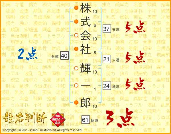 株(10画)式(6画)会(13画)社(8画) 輝(13画)一(1画)郎(10画)