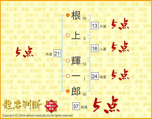 根(10画)上(3画) 輝(13画)一(1画)郎(10画)