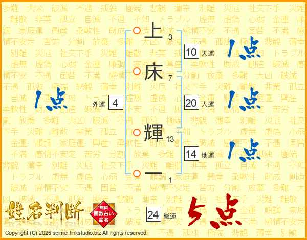 上床輝一さんの人運は20画の1点!