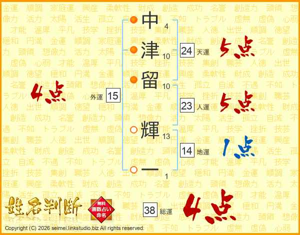 中(4画)津(10画)留(10画) 輝(13画)一(1画)