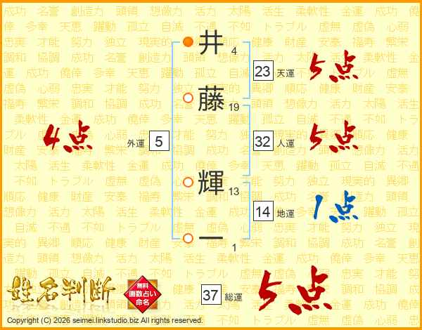 生活面を象徴する運勢です。外部から受ける影響力を表し、結婚運、家庭運や職場、環境への順応性を表します。総運から人運を引いた画数。姓や名が1文字の場合を除く。
