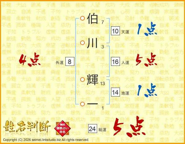 あなたの人生を表す1番重要な運勢です。生涯を通じて影響する総合運となり、主に50歳以降の晩年期に影響を及ぼします。苗字と名前の合計画数。