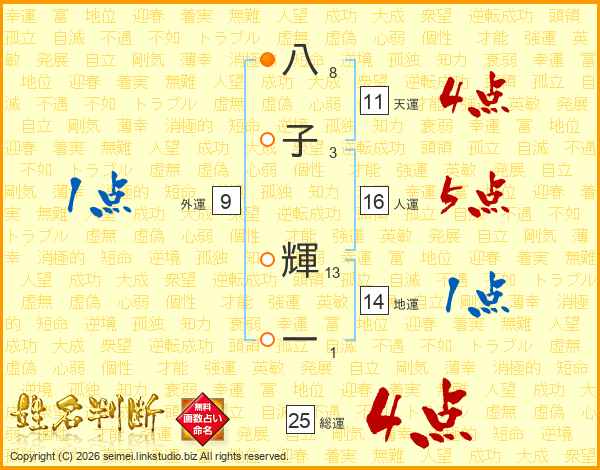 生活面を象徴する運勢です。外部から受ける影響力を表し、結婚運、家庭運や職場、環境への順応性を表します。総運から人運を引いた画数。姓や名が1文字の場合を除く。