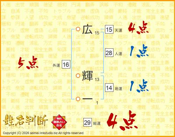 生活面を象徴する運勢です。外部から受ける影響力を表し、結婚運、家庭運や職場、環境への順応性を表します。総運から人運を引いた画数。姓や名が1文字の場合を除く。