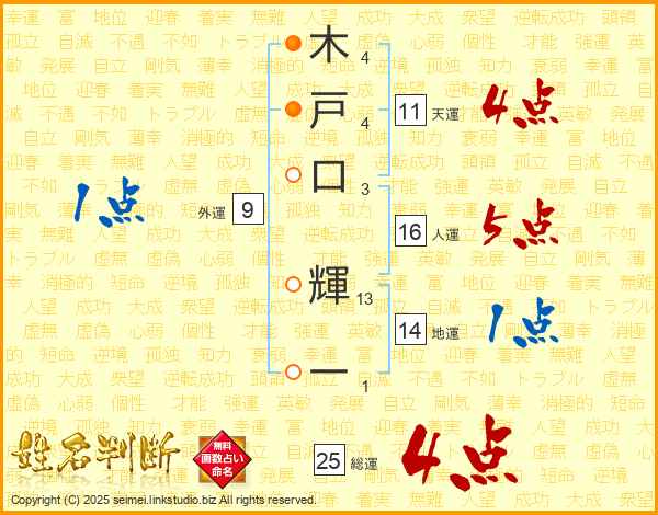 木(4画)戸(4画)口(3画) 輝(13画)一(1画)
