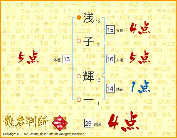 生活面を象徴する運勢です。外部から受ける影響力を表し、結婚運、家庭運や職場、環境への順応性を表します。総運から人運を引いた画数。姓や名が1文字の場合を除く。