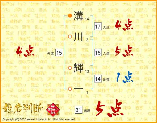 生活面を象徴する運勢です。外部から受ける影響力を表し、結婚運、家庭運や職場、環境への順応性を表します。総運から人運を引いた画数。姓や名が1文字の場合を除く。