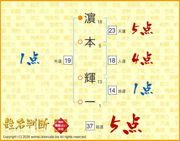 あなたの人生を表す1番重要な運勢です。生涯を通じて影響する総合運となり、主に50歳以降の晩年期に影響を及ぼします。苗字と名前の合計画数。
