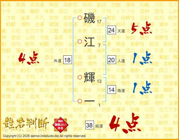 磯江輝一さんの総運は38画の4点!