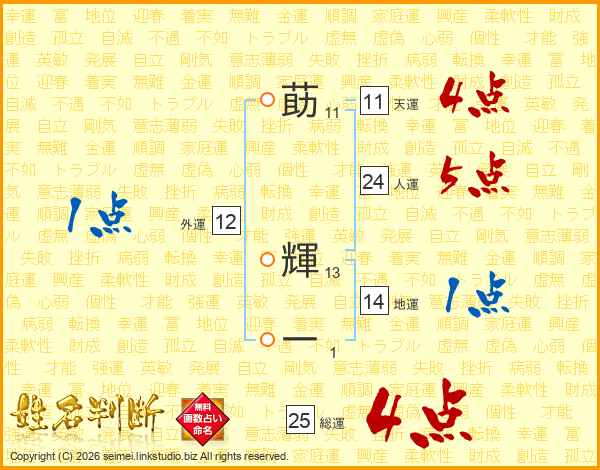 生活面を象徴する運勢です。外部から受ける影響力を表し、結婚運、家庭運や職場、環境への順応性を表します。総運から人運を引いた画数。姓や名が1文字の場合を除く。