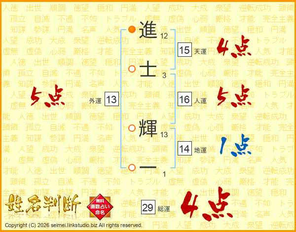 生活面を象徴する運勢です。外部から受ける影響力を表し、結婚運、家庭運や職場、環境への順応性を表します。総運から人運を引いた画数。姓や名が1文字の場合を除く。