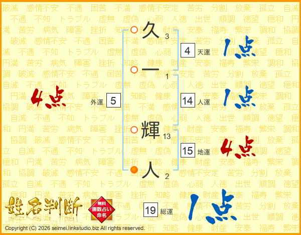 生活面を象徴する運勢です。外部から受ける影響力を表し、結婚運、家庭運や職場、環境への順応性を表します。総運から人運を引いた画数。姓や名が1文字の場合を除く。