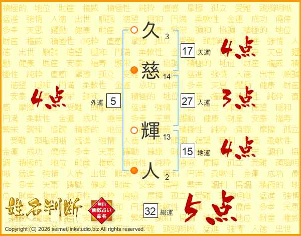 生活面を象徴する運勢です。外部から受ける影響力を表し、結婚運、家庭運や職場、環境への順応性を表します。総運から人運を引いた画数。姓や名が1文字の場合を除く。