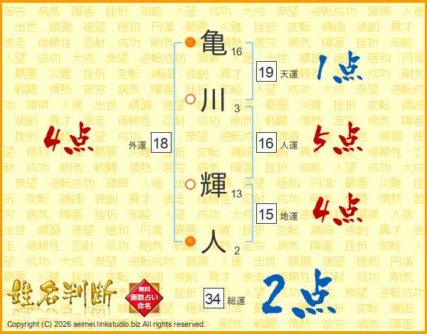 あなたの人生を表す1番重要な運勢です。生涯を通じて影響する総合運となり、主に50歳以降の晩年期に影響を及ぼします。苗字と名前の合計画数。