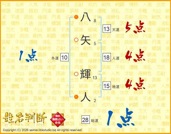 八矢輝人さんの天運は13画の5点!