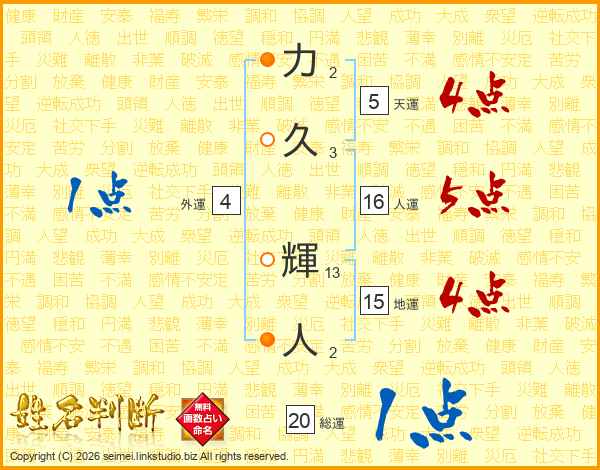 生活面を象徴する運勢です。外部から受ける影響力を表し、結婚運、家庭運や職場、環境への順応性を表します。総運から人運を引いた画数。姓や名が1文字の場合を除く。