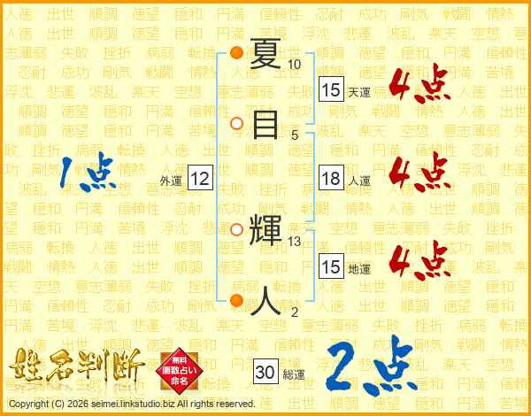 あなたの人生を表す1番重要な運勢です。生涯を通じて影響する総合運となり、主に50歳以降の晩年期に影響を及ぼします。苗字と名前の合計画数。