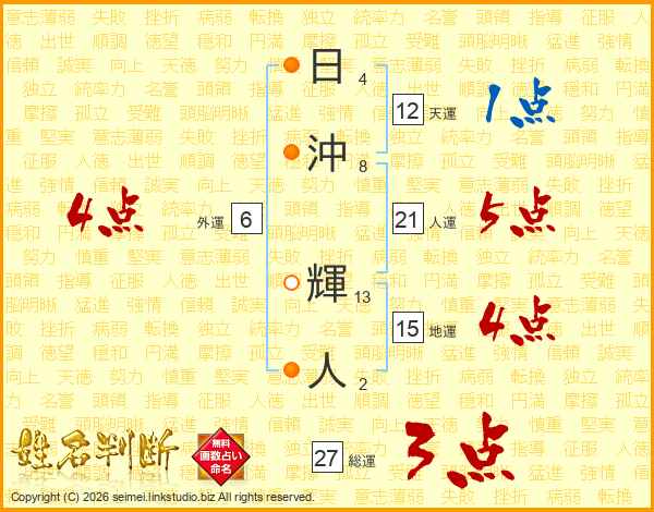 日(4画)沖(8画) 輝(13画)人(2画)