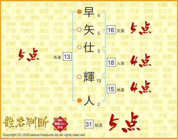 早(6画)矢(5画)仕(5画) 輝(13画)人(2画)