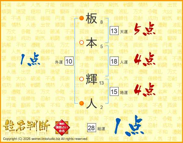 あなたの人生を表す1番重要な運勢です。生涯を通じて影響する総合運となり、主に50歳以降の晩年期に影響を及ぼします。苗字と名前の合計画数。