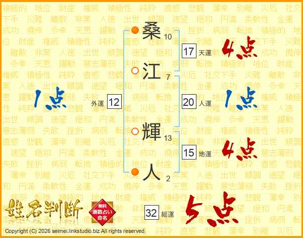 生活面を象徴する運勢です。外部から受ける影響力を表し、結婚運、家庭運や職場、環境への順応性を表します。総運から人運を引いた画数。姓や名が1文字の場合を除く。