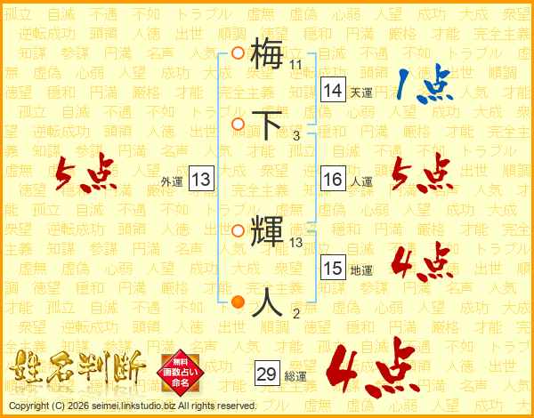 生活面を象徴する運勢です。外部から受ける影響力を表し、結婚運、家庭運や職場、環境への順応性を表します。総運から人運を引いた画数。姓や名が1文字の場合を除く。