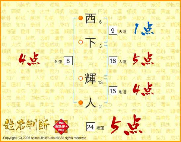 生活面を象徴する運勢です。外部から受ける影響力を表し、結婚運、家庭運や職場、環境への順応性を表します。総運から人運を引いた画数。姓や名が1文字の場合を除く。