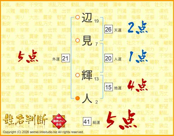 生活面を象徴する運勢です。外部から受ける影響力を表し、結婚運、家庭運や職場、環境への順応性を表します。総運から人運を引いた画数。姓や名が1文字の場合を除く。