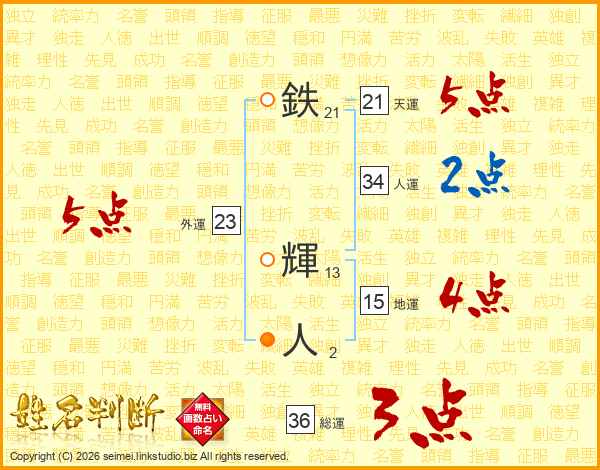 鉄輝人さんの天運は21画の5点!