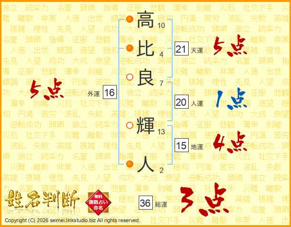 高(10画)比(4画)良(7画) 輝(13画)人(2画)