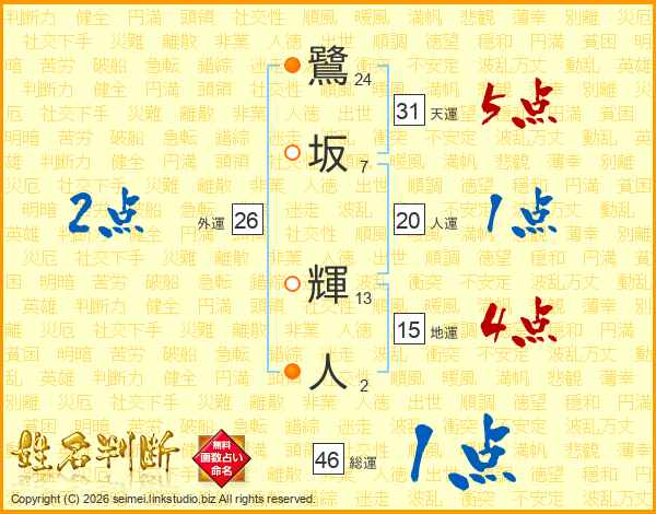 鷺(24画)坂(7画) 輝(13画)人(2画)