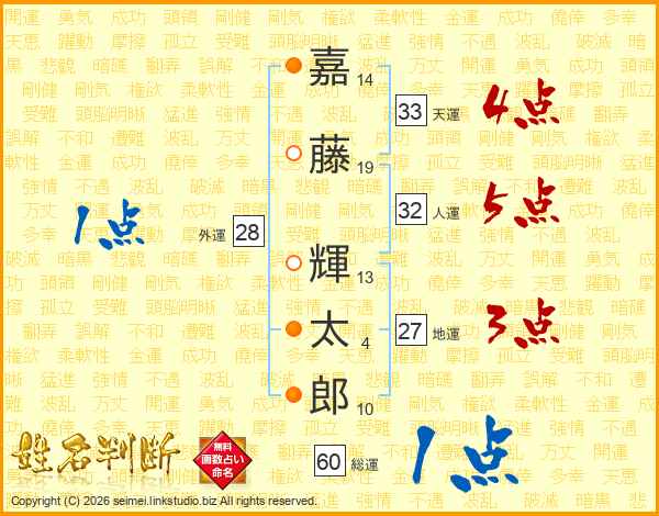 嘉(14画)藤(19画) 輝(13画)太(4画)郎(10画)