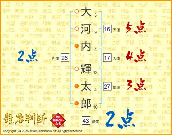 大(3画)河(9画)内(4画) 輝(13画)太(4画)郎(10画)
