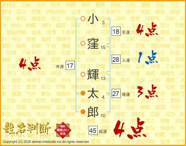 小窪輝太郎さんの総運は45画の4点!