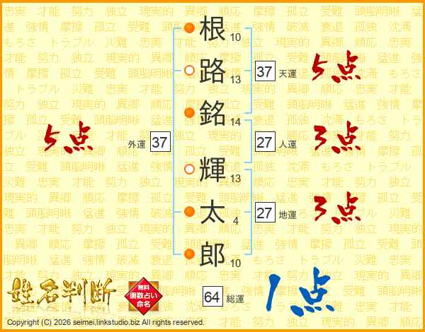 根(10画)路(13画)銘(14画) 輝(13画)太(4画)郎(10画)