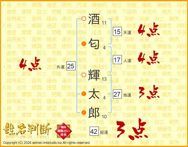 酒(11画)匂(4画) 輝(13画)太(4画)郎(10画)