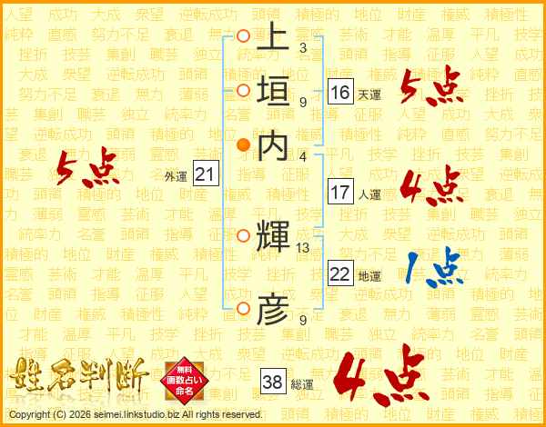 上(3画)垣(9画)内(4画) 輝(13画)彦(9画)