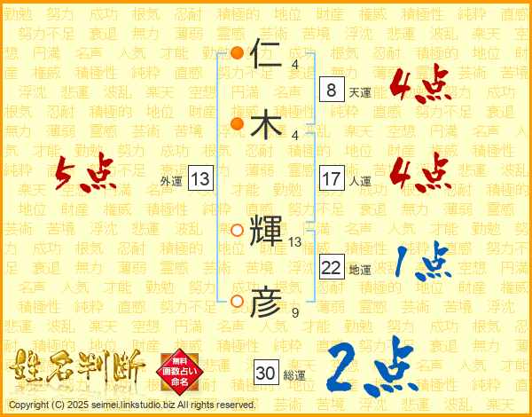 仁(4画)木(4画) 輝(13画)彦(9画)