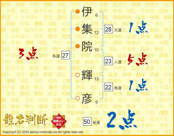 伊(6画)集(12画)院(10画) 輝(13画)彦(9画)