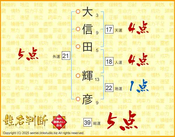 大(3画)信(9画)田(5画) 輝(13画)彦(9画)