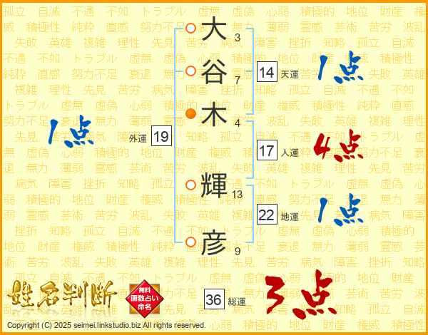 大(3画)谷(7画)木(4画) 輝(13画)彦(9画)