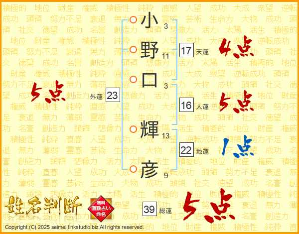 小(3画)野(11画)口(3画) 輝(13画)彦(9画)